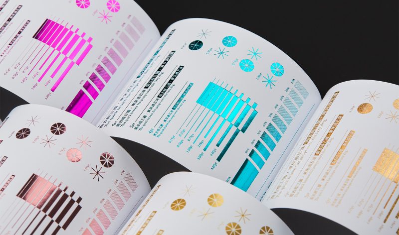 最初想做《箔样 FOIL CATALOGUE》是接触到日本烫金样品的《FOIL SELECTOR》,给了Adam满满的冲击。这样的样品美是美,总是看得到吃不到,当时也很意外台湾没有这样的样品供人参考,因为台湾烫金技术一直有很好的实力,甚至有在世界排行第三的金箔制造商。台湾的金箔样品都只有烫一个色块,并没有各适性的示范样品,因此下定决心制作所有素材包含烫金技术、金箔、纸张、字体都是台湾能够找到的金箔样品。例如箔样内页的「吉祥 G22」,这是金箔的代码,属于一家叫「吉祥」的金箔代理商,而 「吉祥」本身就拥有许多的金箔款式,比如说绿色,在外面就比较看不到。这也是推广箔样工具书时,希望买的人都可以知道,并且在未来实际应用时,可以买到所想要的金箔颜色。