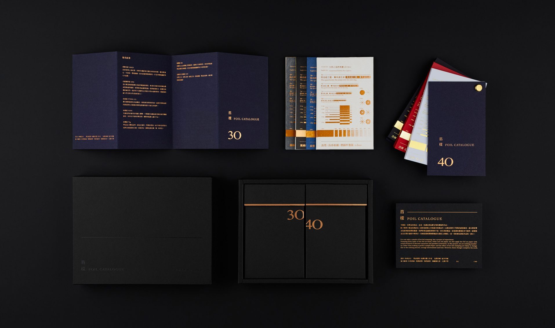 最后,如同现在的英雄电影一样,在箔样内,也埋了一些小彩蛋,不知道大家有没有发现?比方说封面里层还有一层烫黑,以及「40」的样本里除了金属箔之外,还夹了 2 张全球最大的色箔厂商德国的 Kurz色箔。在此偷偷预告下一本关于色箔的作品—— 《色箔样 PIGMENT FOIL CATALOGUE》即将诞生,色箔又叫颜料箔,由于台湾师傅们都称「色箔」,因此Adam也接地气的取名为「色箔」。与金属箔不同的是,它显现出来的效果不像金属箔般具有金属感,而是饱和但带有点半透明的颜色,有鲜艳的色箔也有具消光效果般的色箔,其实台湾以前使用较多,但色箔不好烫,适性较差,比较适合在铜版纸上使用,因此现在也比较少见。