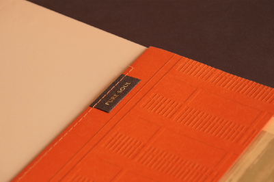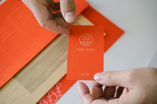 古心斋品牌设计中则有较多弹性。古心斋为提供身心灵净化的咨商启导所,仰角视觉整合试着从宗教神祇的原始象征出发,回推基础且具特殊手感的纸材。其延伸设计物亦采用缝线、打凸呈现自然纯粹的品牌意象。鲜明的橙色是一大亮点,跳脱宗教既定的传统印象,试图打造兼具心灵感知与耳目一新的宗教品牌语汇。