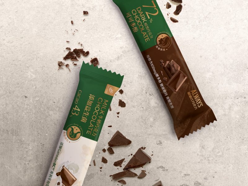 除了品牌形象设计须评估客群、经销等多方层面,业务标设计亦牵涉法规、通路等限制,因此不少品牌倾向最保守的编排方式,以符合信息有效传递及市场需求。近期执行的欧维氏 ALWAYS 品牌,包装业务标采用「文鼎 UD 晶熙黑体」的微字型,解决了以往尚无微字型时会有的漏字问题,软包材运用上时常出现的字体变形也大幅改善,达成了功能性与视觉性平衡。仰角视觉整合更试着加入活泼的设计巧思,像是为添加可可多酚、益生菌的两款机能性巧克力设计icon,条形码上更多了流动的巧克力熔岩符码,为一向制式化的信息标示增添不少细腻的互动巧思。